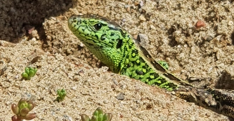 Helga, die alte Zauneidechsen Dame aus Aschersleben und Alfonso de Gelmini, der freche Mauereidechsen Junge aus Florenz, erklären auf Schautafeln den Kindern die Welt der heimischen Lurche und Kriechtiere.